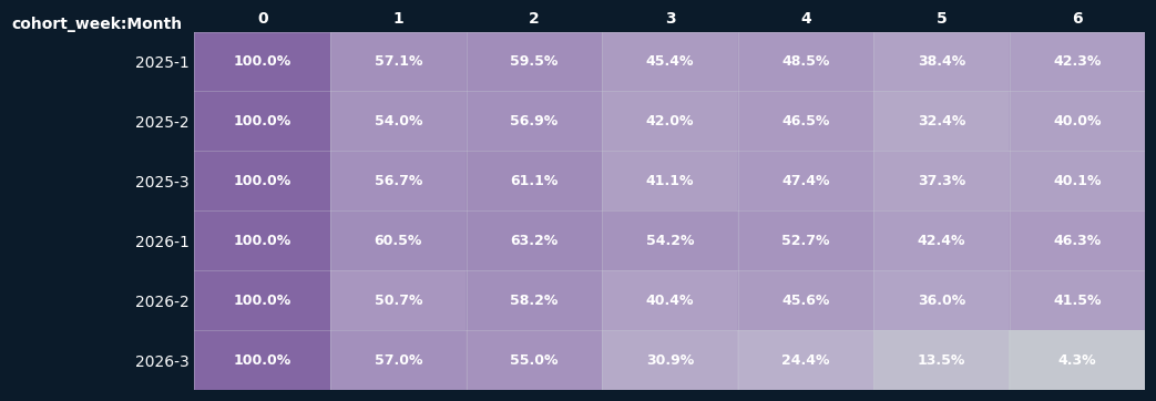 Built a custom retention cohort heatmap in Metabase using SQL to measure repeat purchase behaviour by order number and compare year-over-year cohort performance (amongst other retention tools within the dashboard)